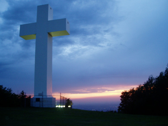A cross on a hillside beckons for our attention,