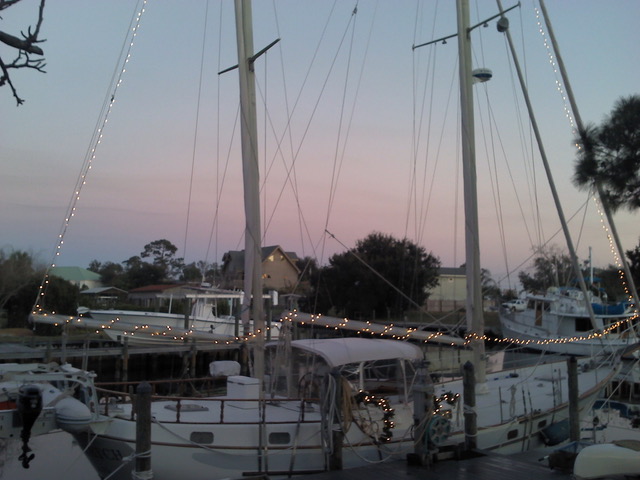 Safely at dock, with its sweet Christmas lights raised, a sailboat spreads cheer, for our God is to be praised…